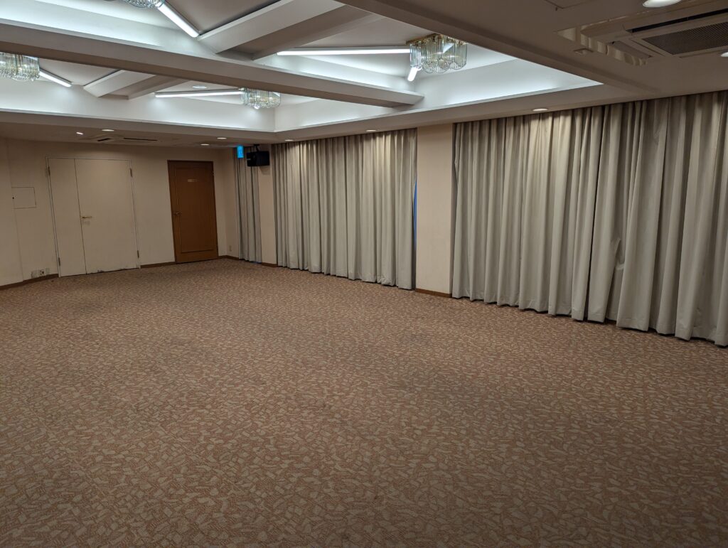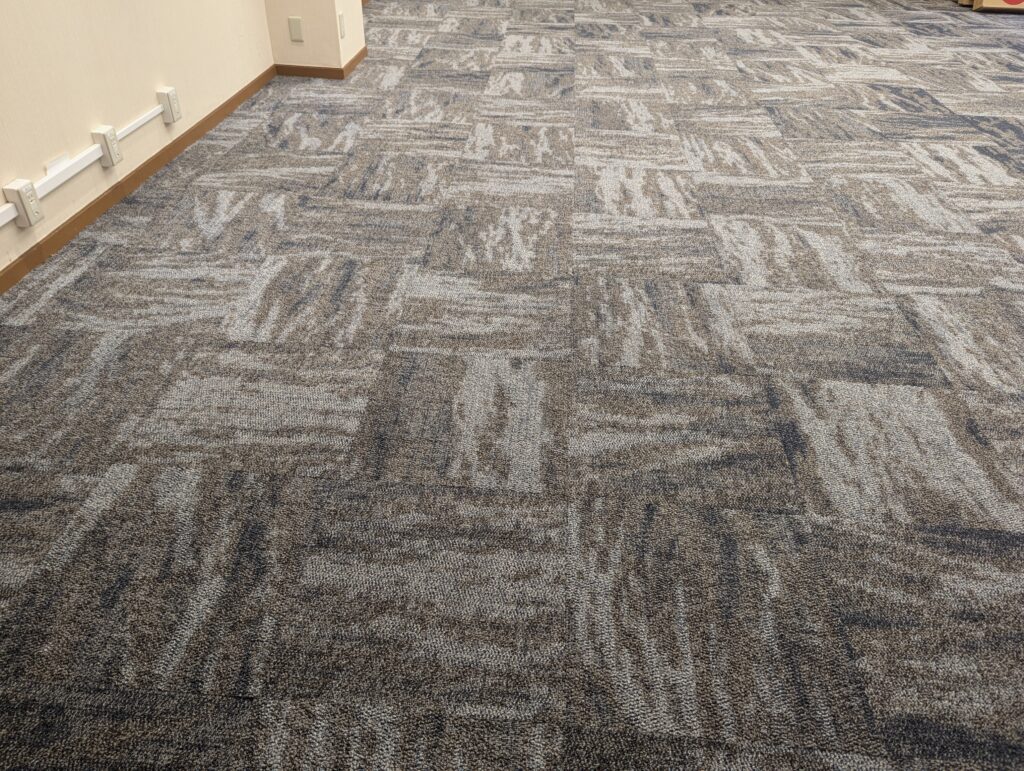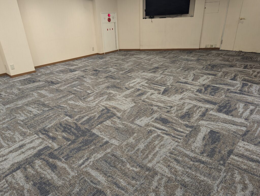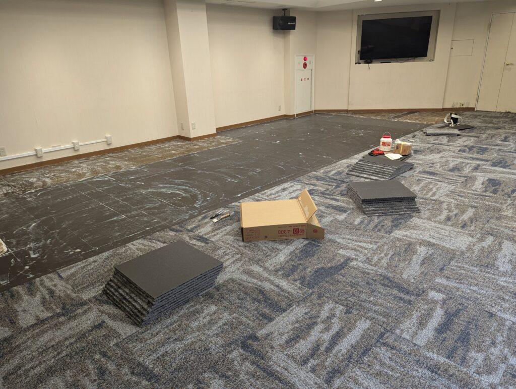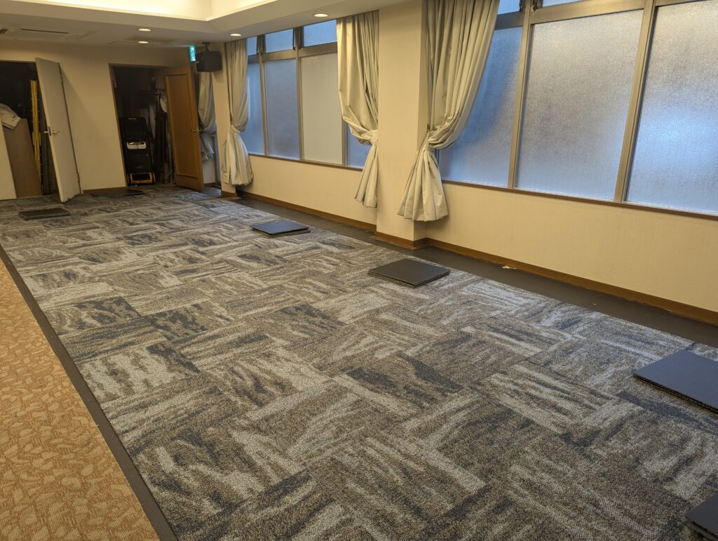 赤坂のホテルの宴会場のタイルカーペットの貼替えをしました。はじめは荷物移動からと聞いていたので朝7時に入ったのですがホテルの方が荷物移動を先に終わらせてくれて凄く助かりました。ホテルのタイルカーペットなので住宅や事務所に普段貼るものと比べると少しお高い材料でしたが、材料の幅も少し厚めでしっかりとした製品。ホテルは高級感が大事ですね。支配人にも喜んで頂けて良かったです。