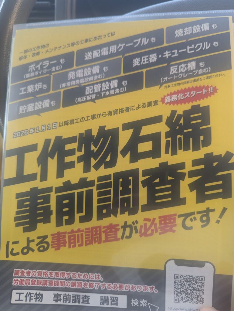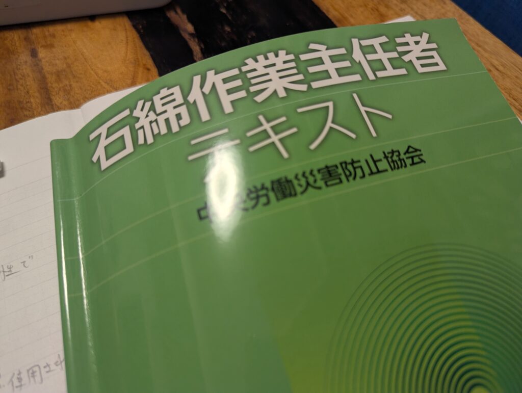 先日石綿作業主任者の資格を取得しました。(国家資格)石綿とは近年問題になっているアスベストです。2026年1月から石綿が含まれている可能性のある建物を解体する場合は主任者、調査者を立てないと工事をしてはいけないと国が発表致しました。そこで内装に携わる者としてこの資格を持つべきだと思い試験を受けてまいりました。練馬区豊玉の会場に行き主任者を取得し、次は調査者の試験を受けるか考え中です。仕事の流れをみてもし余裕があれば行きたいと思います。