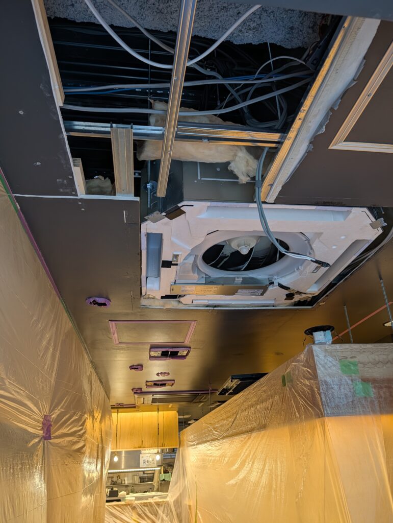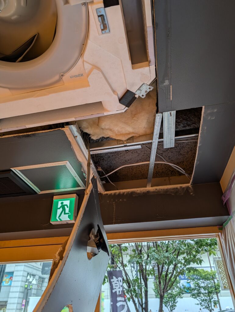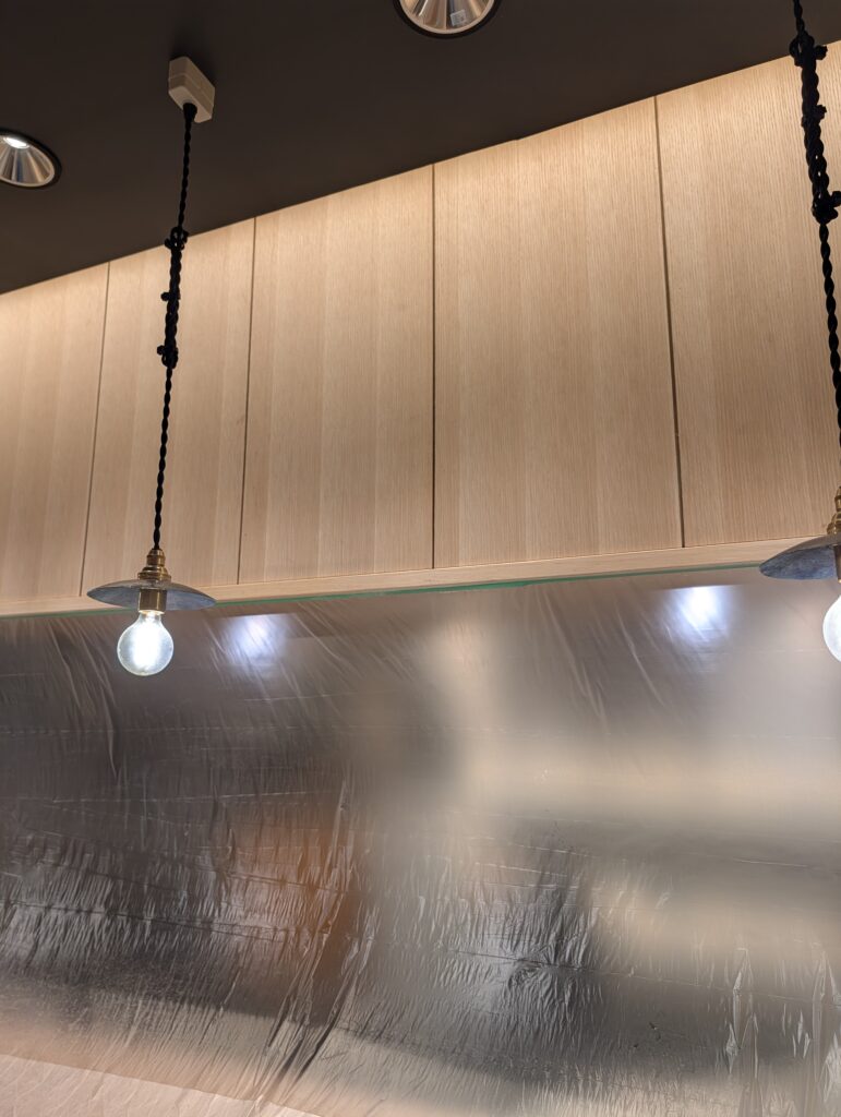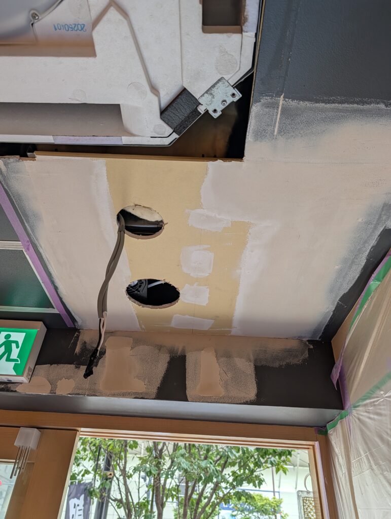 以前施工した店舗の天井裏に、湿気が溜まりすぎて天井のボードが浮いて来たとご相談を頂きました。既に天井裏は設備屋さんが入って換気の問題は解決していたのですが浮き上がったボードは貼り替えて塗装も塗り直しました。厨房前のカウンター上の棚、こちらも湿気でカビが生えてしまったので貼り替えてクリア塗装をしました。