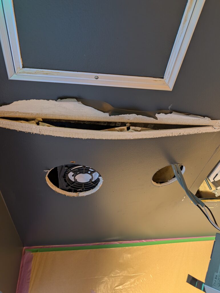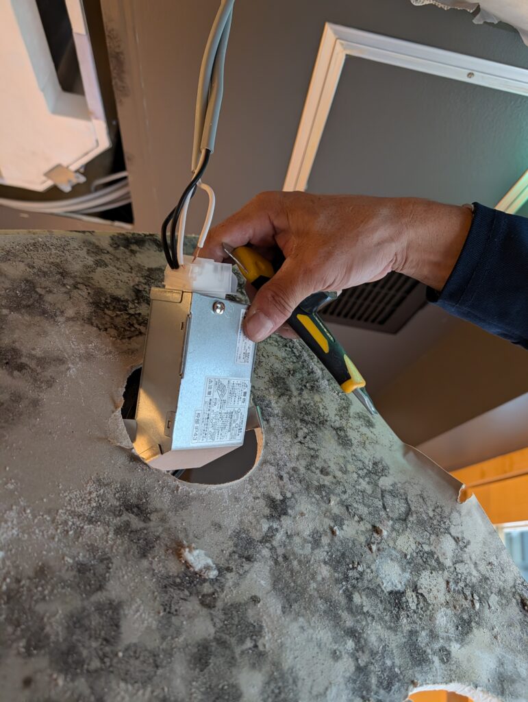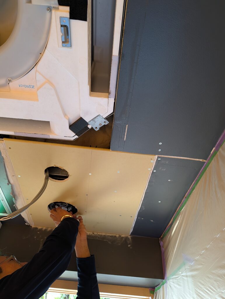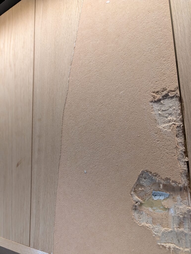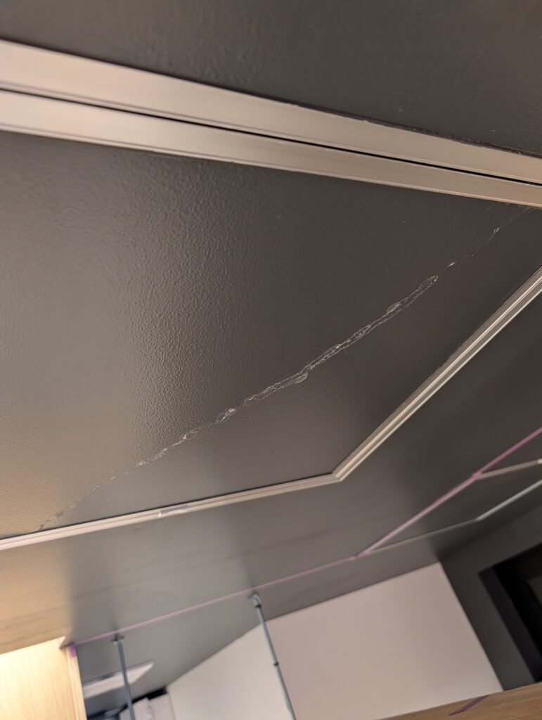 以前施工した店舗の天井裏に、湿気が溜まりすぎて天井のボードが浮いて来たとご相談を頂きました。既に天井裏は設備屋さんが入って換気の問題は解決していたのですが浮き上がったボードは貼り替えて塗装も塗り直しました。厨房前のカウンター上の棚、こちらも湿気でカビが生えてしまったので貼り替えてクリア塗装をしました。