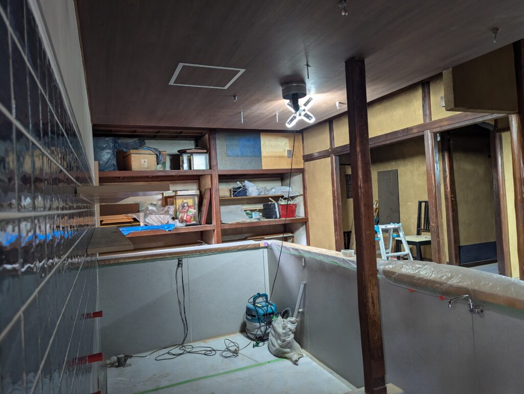 厨房の天井クロスを貼り終えました。タイル屋さんや大工さんがいない日にと日程を伺っていましたが昨日なんとか施工が終わりました。木目のクロスでしたので長手で貼らないといけなかったので2人でなんとか。材料も