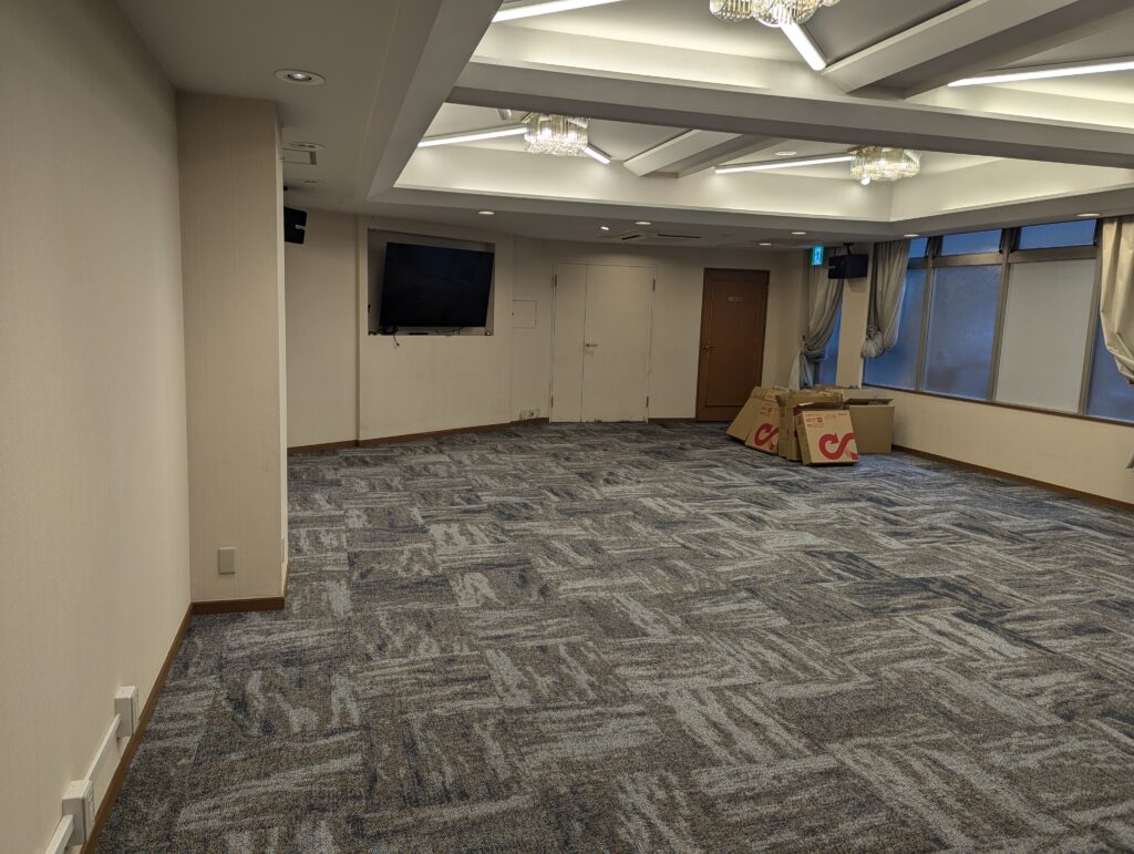 赤坂のホテルの宴会場のタイルカーペットの貼替えをしました。はじめは荷物移動からと聞いていたので朝7時に入ったのですがホテルの方が荷物移動を先に終わらせてくれて凄く助かりました。ホテルのタイルカーペット